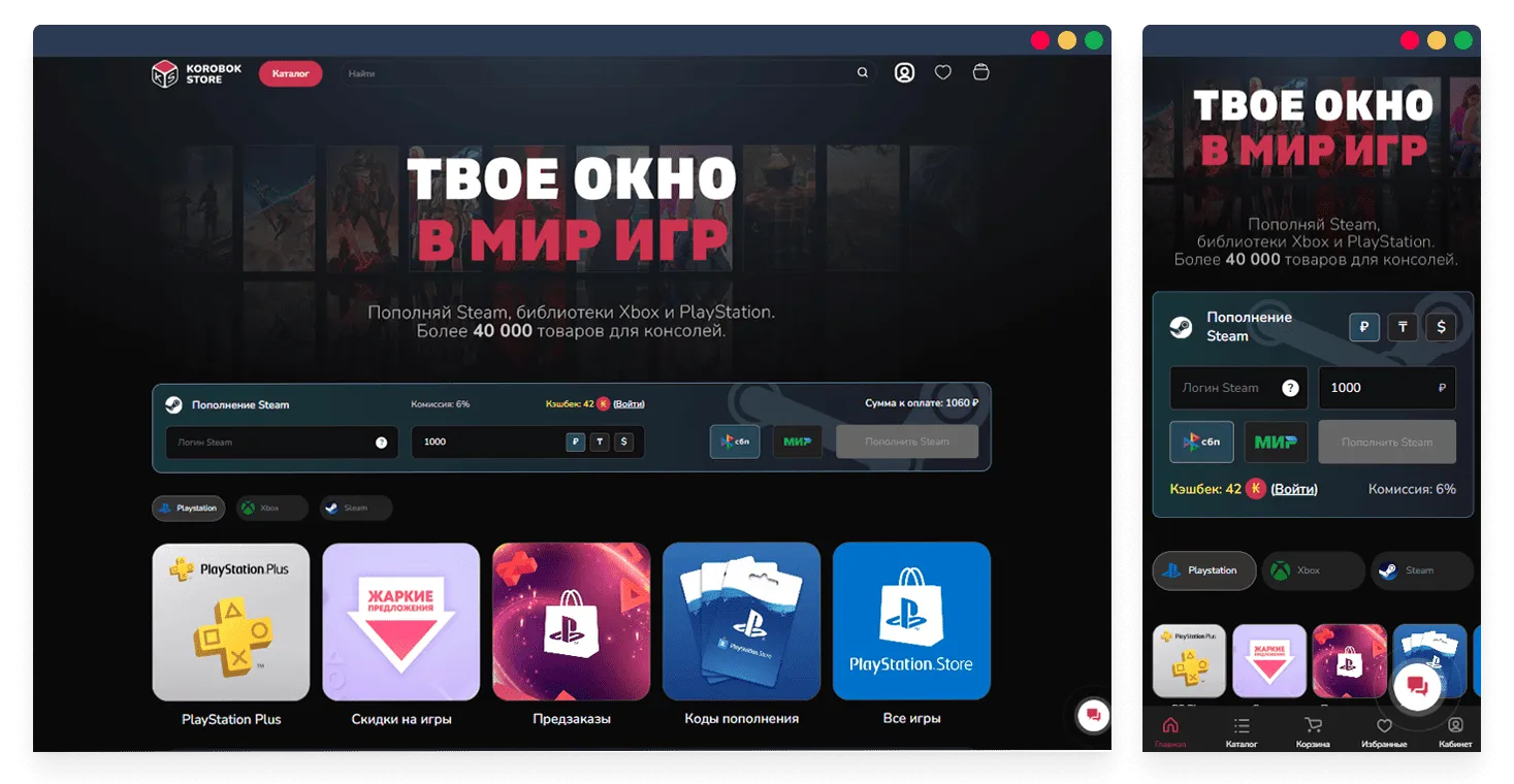 Korobok.store — платформа для приобретения видеоигр и пополнения кошелька Steam, PlayStation и Xbox. Функционал сайта оптимизирован для удобного поиска и покупки игр, а обширный каталог включает более 40 000 товаров для консолей.