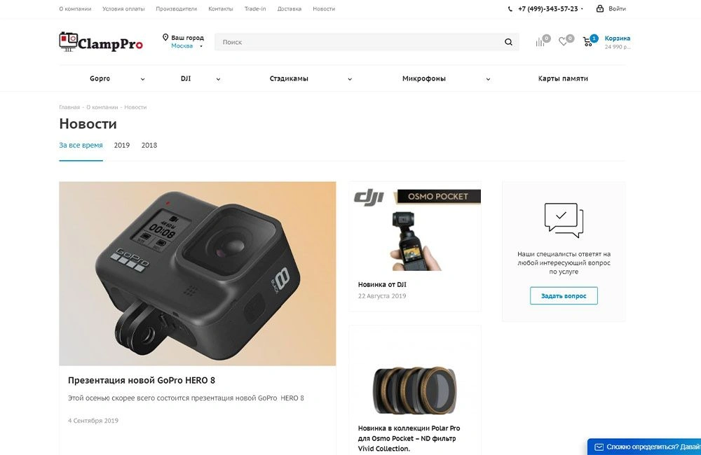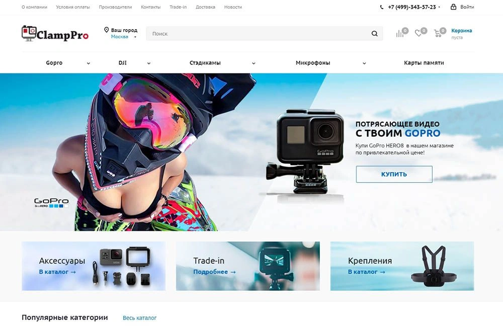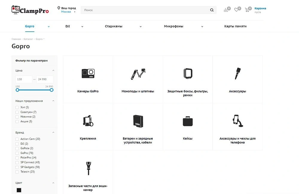 Интернет-магазин ClampPro предлагает широкий ассортимент камер GoPro и техники DJI, а также стедикамов, микрофонов и прочих аксессуаров для блогеров и экстремалов. Компания имела собственный сайт на OpenCart с ограниченным функционалом и слабыми показателями. Мы подобрали готовое решение Аспро и выполнили переезд на Битрикс. Подключили и настроили мультирегиональность на крупные города миллионники, всего 20 поддоменов. Автоматически наполнили сайт товарами с помощью парсинга cайтов конкурентов. Настроили Real-Time обмен с 1С. Настроили модули оплаты и доставки. Выполнили внутреннюю оптимизацию и работы по продвижению сайта. За полгода трафик посетителей из поиска увеличился в 15 раз.
