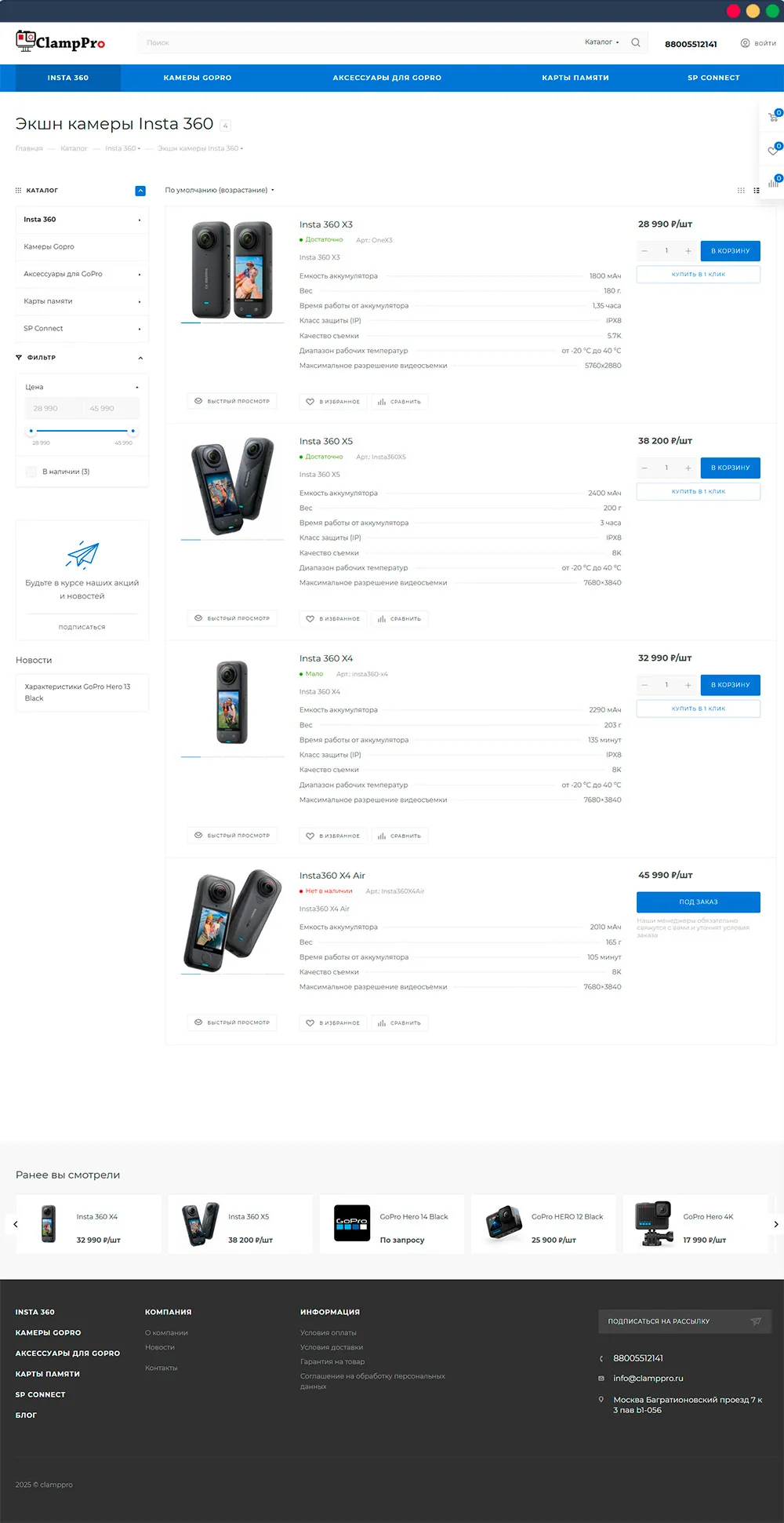 Интернет-магазин ClampPro предлагает широкий ассортимент камер GoPro и техники DJI, а также стедикамов, микрофонов и прочих аксессуаров для блогеров и экстремалов.